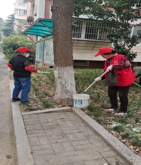 社區(qū)黨員志愿者們按要求給每棵樹標定1.2米的基準線,頂端纏繞紅色膠帶,然后利用生石灰、防蟲藥劑等混合配比液進行刷白,刷白后不僅能夠防蟲防凍,還起到美化效果。在保護好樹木的同時,還將林帶內(nèi)的垃圾、雜物、雜草進行清理。大家通過分工合作,耐心仔細地為大樹披上了一件又一件健康、溫暖的白色“冬衣”,為社區(qū)增添了一道亮麗的風景線。