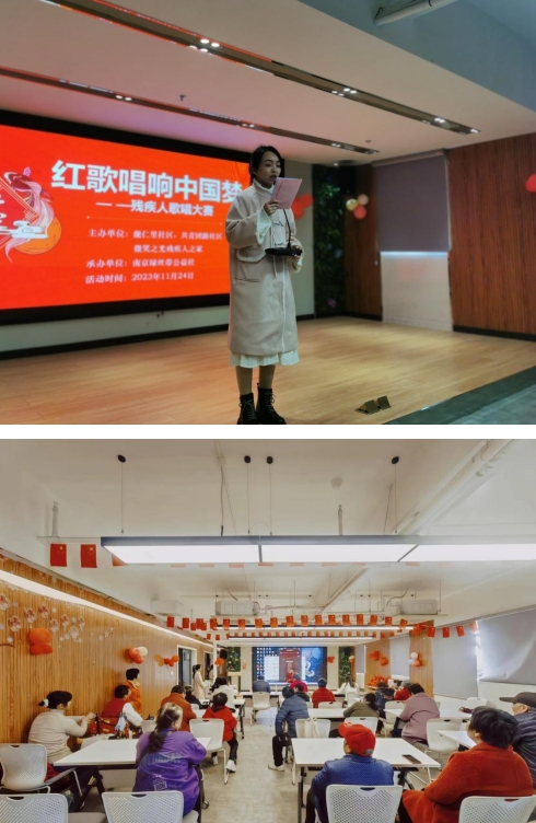 2023年12月3日是第32個(gè)國際殘疾人日,在此到來之際,由雨花街道能仁里社區(qū)、共青團(tuán)路社區(qū)、微笑之光殘疾人之家聯(lián)合主辦,南京綠絲帶公益社承辦的主題為“紅歌唱響中國夢”殘疾人歌唱大賽于鄰里薈五樓圓滿完成,來自轄區(qū)(能仁里社區(qū)、共青團(tuán)路社區(qū))的20幾名殘疾人及家屬參與了本次活動(dòng)。其中,能仁里社區(qū)郭星敏主任、共青團(tuán)路社區(qū)楊玉彬主任、南京綠絲帶理事袁鳳蘭女士出席本次活動(dòng)并擔(dān)任大賽評委。其中能仁里社區(qū)郭星敏主任上臺(tái)致辭給予本次歌唱大賽極大的肯定和期許。賽中,每一位殘疾人都以熱情飽滿的狀態(tài)演唱自己最拿手的經(jīng)典紅歌,唱響心中中國夢,共同祝福祖國繁榮昌盛,展現(xiàn)了新時(shí)代殘疾人自信自強(qiáng)的獨(dú)特風(fēng)采。