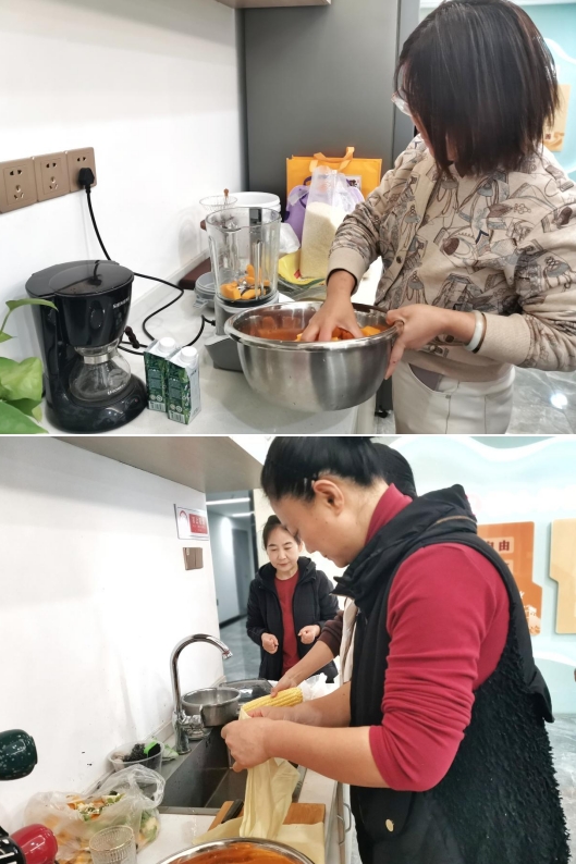 活動地點安排在龍西社區(qū)新時代文明實踐站的美食廚房,鄰居們有的自己帶上愿意與鄰居們分享的食物:火鍋食材、餐后水果、餐后甜點,這些琳瑯滿目的菜品、甜品讓大家胃口大開;有的早早來到社區(qū)幸福廚房做起大廚,你切、我洗、她熬鍋底,為了培養(yǎng)健康的飲食方式,大家還榨起了南瓜牛奶米糊。就這樣,一邊干活、一邊交流廚藝心得,不一會功夫,一頓豐盛的長桌午餐就完成了,居民們圍坐在一起,嘮家常、吃火鍋,感受秋冬時節(jié)這特別的、溫馨的大家庭氛圍。