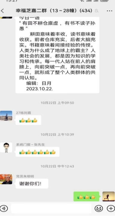 雖然這看似不起眼的小事情,但正是他的堅持讓這一切發(fā)生。尤其在2020年疫情最嚴峻的時候,居民們基本上都不外出,大多數(shù)時間都在家中刷手機。這種情況下,朱明明依舊堅持不懈,給微信群中的居民傳播每天的正能量,讓他們感受到了無盡源源的激勵。