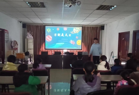 隨著清脆的鈴聲響起,天文知識的探索之旅拉開帷幕。陳政同學(xué)向小朋友們介紹了日常生活中見到的星體,并講述了登月的歷程,隨后陳政通過引入一些簡單的天文問題,引發(fā)小朋友們對宇宙的思考,并引導(dǎo)他們討論流星現(xiàn)象。通過陳政同學(xué)生動有趣的講解,小朋友們聽的津津有味,紛紛舉手回答問題,和老師積極互動。