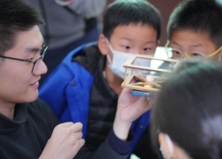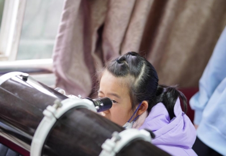 接著引入了實驗“水流透光”,讓小朋友們更加直觀的了解到了光在水流和空氣邊界上發(fā)生全反射。隨后讓小朋友們通過三棱鏡觀察了光的色散,老師生動的講解和同學(xué)們積極的互動,小朋友們對光產(chǎn)生了濃厚的興趣,了解了一些簡單光學(xué)知識后,志愿者和社區(qū)工作人員帶領(lǐng)大家來到設(shè)置好的專業(yè)天文望遠(yuǎn)鏡旁,感受體驗了望遠(yuǎn)鏡中的成像。