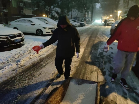 傍晚時(shí)分,由社區(qū)工作人員、物業(yè)人員、黨員骨干和平安志愿者組成的掃雪隊(duì)伍集結(jié)到位,全副武裝,迅速投入清雪作業(yè)中。現(xiàn)場(chǎng),大家分工協(xié)作,以“動(dòng)”制“凍”,有的清鏟積雪,有的清掃路面,有的灑融雪劑,有的鋪設(shè)草墊......一派熱火朝天的景象??吹?ldquo;掌上云”社區(qū)群內(nèi)的掃雪動(dòng)態(tài),不少居民紛紛下樓,參與到掃雪防凍行動(dòng)中,有精神抖擻的青年,有不讓須眉的巾幗,有白發(fā)蒼蒼的老人,也有互動(dòng)有愛的親子,從夜色朦朧到花燈初上,一個(gè)個(gè)忙碌的身影成為小區(qū)內(nèi)一道靚麗的風(fēng)景線。