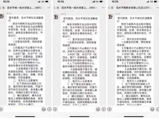 考慮到外出居民出行安全,社區(qū)網(wǎng)格員定時(shí)巡查小區(qū)積雪情況,以防老舊設(shè)施及樹木積雪較多造成垮塌傷人,同時(shí)社區(qū)通過“掌上云”微信群發(fā)布雪天安全防范措施、雪天行人注意事項(xiàng)、雪天駕車注意事項(xiàng)等,提醒居民注意雪天出行安全!