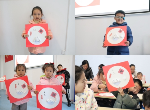 繪本故事結(jié)束后,志愿者繼續(xù)帶領(lǐng)小朋友們做起了餃子和湯圓的創(chuàng)意粘土畫。小朋友們?cè)诩t白相間象征團(tuán)圓的圓形卡紙上,搓出了圓圓滾滾的湯圓,白白胖胖的餃子,貼上了體現(xiàn)中國傳統(tǒng)年俗的“福”字。當(dāng)然也少不了小朋友們喜歡的酸酸甜甜的糖葫蘆。