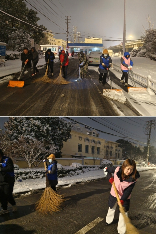 當(dāng)晚所有工作人員待命,雪稍微小了一些,在黨委書記的安排下,大家有條不紊地開展掃雪工作。書記帶領(lǐng)著幾名女同志用推雪鏟在前方開路,幾名男同志用鐵鍬將地面上結(jié)的冰鏟松,方便跟在后邊的志愿者用掃帚將道路上殘留的雪和冰清掃到道路兩邊,清出一條可供汽車和行人通行的道路出來。網(wǎng)格員還在道路上撒上鹽,防止道路繼續(xù)結(jié)冰。