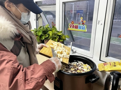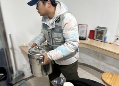 梨湯熬好后, 裝入保溫桶,送達(dá)目的地。