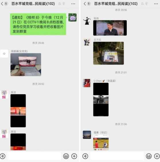 當晚,百水芊城社區(qū)黨委通過“掌上云”微信群里,號召平日里上班年輕黨員及腿腳行動不便老黨員及時參與線上學習,收看《榜樣8》專題節(jié)目,并在群里簽到發(fā)圖片和視頻,掀起學習新熱潮,引導廣大黨員見賢思齊,追尋榜樣足跡、汲取榜樣力量。