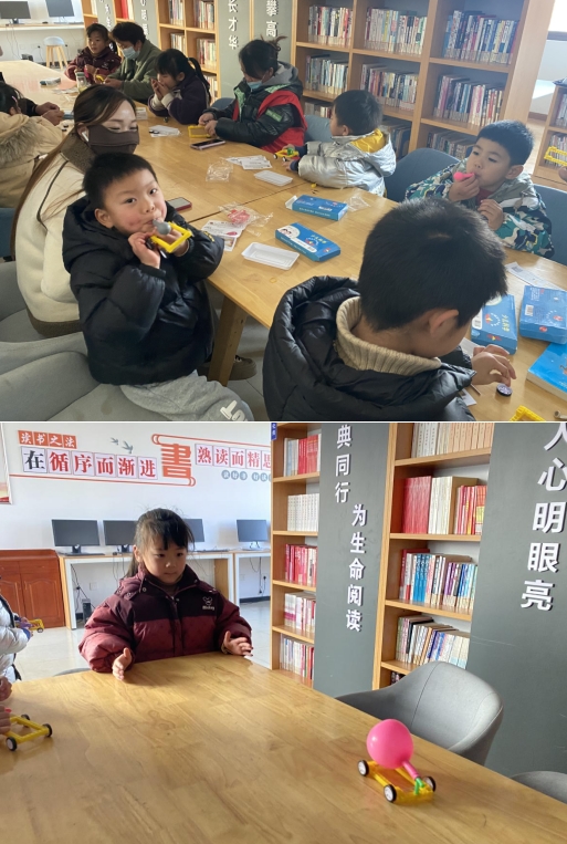 活動開始前,志愿者老師通過幾個互動小游戲讓孩子們感受作用力與反作用力,引導孩子們認識反沖力。很快激發(fā)了孩子們的發(fā)散思維,能夠聯(lián)系生活找到很多運用反沖力的例子。小朋友們恍然大悟,原來火箭、煙花等都運用這一科學原理。在制作反沖力小車的過程中,孩子們認真專注,不太熟練地學著用皮筋扎緊氣球,吹氣球時吹得滿臉通紅,可是當小車在氣球放氣的反推下快速走動時,孩子們一個個高興地跳起來,迫不及待地找?guī)讉€好朋友去進行比賽。在比賽中,小朋友們也得出一個結(jié)論,原來氣體量越大,反沖力就越大,小車也就跑得越快越遠。在這濃厚的科學氛圍下,滿足了小朋友們的好奇心,開啟了小朋友們的探索之路。