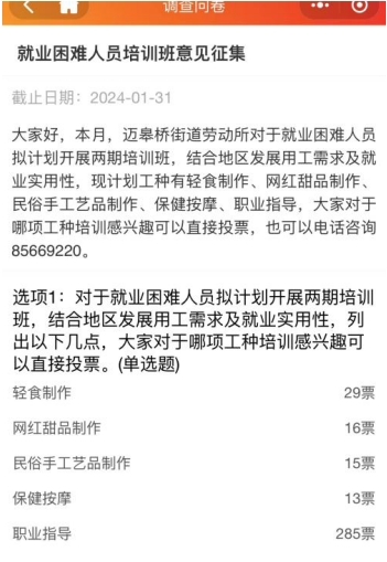 通過線上征集意見的方式為困難群體提供了表達(dá)職業(yè)興趣和需求的平臺(tái),提供更多就業(yè)機(jī)會(huì),同時(shí)也促進(jìn)構(gòu)建社區(qū)就業(yè)服務(wù)圈,把就業(yè)援助細(xì)化落實(shí)到基層社區(qū),讓群眾在“家門口”享受就業(yè)服務(wù),實(shí)現(xiàn)就業(yè)創(chuàng)業(yè)。
