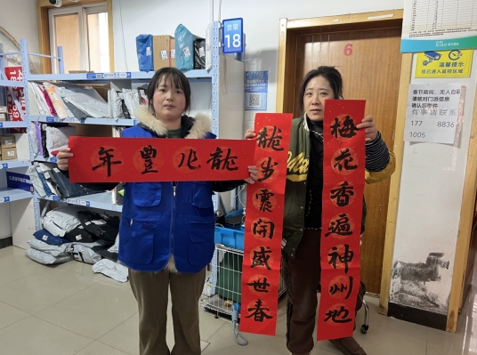社區(qū)職工志愿者們深入到快遞驛站,為辛勤工作的員工們送上了寓意吉祥如意的春聯(lián)。這些精心挑選的對(duì)聯(lián),字里行間洋溢著溫馨與幸福,傳遞著濃濃的節(jié)日祝福,為即將到來的春節(jié)增添了無盡的喜慶氣氛,也為大家?guī)チ藵M滿的福氣與誠摯的祝愿。