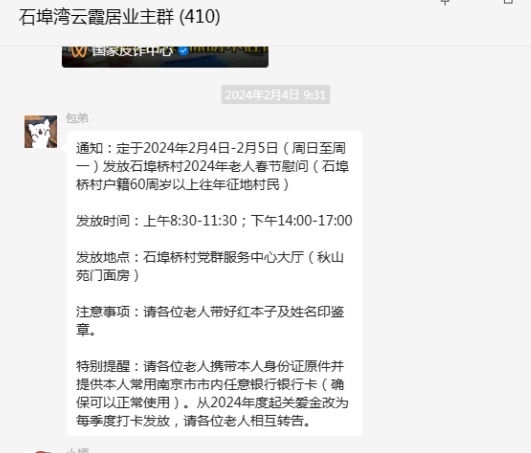 為了讓社區(qū)的老人們度過一個溫馨、快樂的春節(jié),南京市棲霞區(qū)棲霞街道石埠橋村社區(qū)利用掌上云社區(qū)微信群發(fā)布信息,決定于2024年2月4日至5日,為60周歲以上的往年征地村民發(fā)放春節(jié)慰問金。