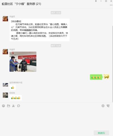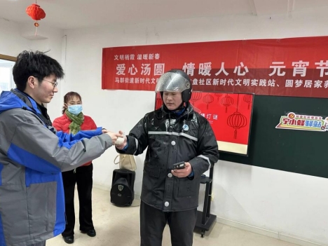 “小哥們辛苦了,來喝碗現(xiàn)煮的湯圓吧!”隨著寧小蜂驛站志愿者一聲聲親切的問候,路過的快遞員、外賣員小哥紛紛駐足觀望:“非常感謝,以后微信群里常聯(lián)系!”與此同時,另一部分黨員志愿者也將象征著闔家團(tuán)圓的元宵送到轄區(qū)各個快遞站點工作人員的手中,向他們傳達(dá)最誠摯的節(jié)日祝福和問候,讓他們切實感受到蛇盤社區(qū)大家庭的溫暖。
