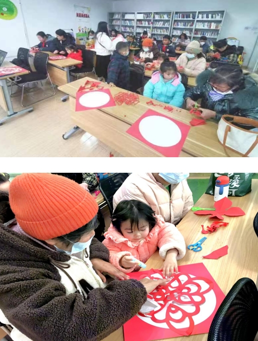 故事會前,老師先帶領孩子們一起做熱身活動手指謠,充分調動了孩子的積極性。之后志愿者老師繪聲繪色地講解了繪本《春?!?,故事以除夕為舞臺,講述掉落人間的精靈小福氣,在孤單無助的夜里走進了狐貍面館,因為小狐貍的善良和分享,小福氣發(fā)現(xiàn)了不一樣的自己,通過自我成長創(chuàng)造了不可思議的幸福除夕。志愿者老師在閱讀過程中積極引導家長與孩子互動,共同探討故事情節(jié),并通過角色扮演,讓孩子深入理解人物性格,感受到福氣傳遞的幸福和美好,明白了溫柔和善良有著不可思議的力量。最后,老師帶領著孩子和家長一起剪窗花,進一步加深了孩子們對中國傳統(tǒng)文化的了解。