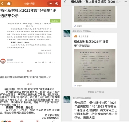 本次評選在“掌上云社區(qū)”內(nèi)發(fā)布通知,先由居民自薦或者推薦候選人,隨后社區(qū)篩選出3對“好鄰里”,并將結(jié)果在“掌上云社區(qū)”內(nèi)進行公示。