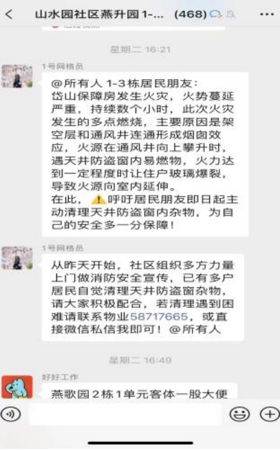 “各位居民,通風(fēng)井和樓道內(nèi)雜物亂堆亂放,這不僅影響了小區(qū)的整潔美觀,更可能帶來(lái)安全隱患,如火災(zāi)等。請(qǐng)您主動(dòng)清理包括廢棄家具、紙箱、塑料袋等各類雜物……”社區(qū)網(wǎng)格員依托掌上云社區(qū)群呼吁廣大居民朋友盡快自行清理天井樓道雜物,向居民發(fā)放一封信,號(hào)召居民注意安全用火用電用氣、及時(shí)清理天井雜物,拒絕電動(dòng)車及電池進(jìn)樓入戶,提升群眾參與消防安全的積極性,引導(dǎo)構(gòu)建人人有責(zé)、人人盡責(zé)的良好局面。同時(shí),社區(qū)聯(lián)合物業(yè)針對(duì)排查過(guò)程中發(fā)現(xiàn)的天井雜物,積極幫助居民進(jìn)行清理,還給居民整齊有序、安全潔凈的居住環(huán)境。