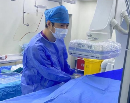 由于患者肝右葉占位巨大,完全遮擋右側(cè)穿刺路徑,左肝管為唯一穿刺路徑。介入科彭鵬醫(yī)生與重癥醫(yī)學(xué)科討論后,征得患者家屬同意后,擬行左側(cè)經(jīng)皮肝內(nèi)膽管穿刺引流術(shù)。術(shù)中一針便成功進(jìn)入膽道系統(tǒng),導(dǎo)絲引流管放置順利,造影顯示膽道系統(tǒng)顯影滿意,側(cè)孔位置可,引流順暢,37分鐘便結(jié)束了手術(shù),術(shù)后順利轉(zhuǎn)入普外科護(hù)理治療。這例手術(shù)的成功開展,刷新了該院介入團(tuán)隊(duì)高齡患者手術(shù)的新記錄!