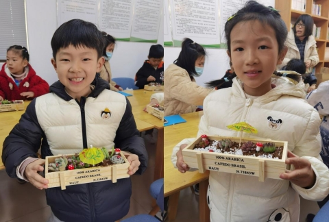 聽講完畢后,進(jìn)入了實(shí)踐環(huán)節(jié),老師逐一發(fā)放了種植多肉所需的全套工具和材料。孩子們滿心期待,躍躍欲試,迅速投入到親手種植多肉植物的世界中。他們手持小巧的園藝工具,興趣盎然地按照指導(dǎo)步驟操作,先往種植盆內(nèi)填入適當(dāng)?shù)姆N植土,再將一株株晶瑩剔透多肉小心地移入盆內(nèi),然后填土壓實(shí),最后進(jìn)行裝點(diǎn),一盆盆各具特色的多肉微景觀便在孩子們手中誕生了。老師全程鼓勵(lì)大家積極創(chuàng)新,讓每個(gè)孩子都化身為創(chuàng)意滿滿的小小花匠,親手打造屬于自己的綠色天地。