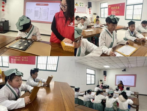 活動現(xiàn)場,“童”學(xué)們身著唐裝,手捧竹簡,目不轉(zhuǎn)睛的欣賞志愿者老師精心準(zhǔn)備的《望岳》、《無題》等郵票......“杜甫《望岳》詩采用楷體書寫,書法采用唐代顏真卿作品集字,沉穩(wěn)厚實(shí),表現(xiàn)了詩人雄心氣魄;李商隱《無題》郵票,畫面設(shè)計(jì)為卷起的古版《唐詩三百首注疏》刻本《無題》頁面。”這些郵票以唐詩為主題,通過郵票設(shè)計(jì)師的巧妙構(gòu)思和精湛技藝,將唐詩的意境和韻味融入郵票圖案之中,詩意濃厚,展現(xiàn)了唐詩的獨(dú)特魅力和豐富內(nèi)涵。同時,志愿者還為大家講解每一張郵票背后的故事,以及古詩的韻律和意境。現(xiàn)場氣氛熱烈而溫馨。