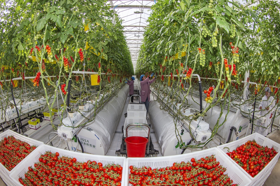無土栽培,水肥滴灌,一串串水果番茄水靈靈、紅彤彤。近日,記者來到江蘇邳州市戴圩街道的綠色生態(tài)水果番茄項(xiàng)目基地,在一處上萬平方米的玻璃溫室內(nèi)探尋當(dāng)?shù)剞r(nóng)業(yè)新質(zhì)生產(chǎn)力。溫室內(nèi),番茄栽培架整齊排列,秧苗植根于一塊塊巖棉里,技術(shù)人員根據(jù)植株不同階段的生長需要調(diào)整營養(yǎng)配方。據(jù)邳州金水杉農(nóng)業(yè)科技有限公司生產(chǎn)技術(shù)部總監(jiān)程勝利介紹,這里采用了國際先進(jìn)的普瑞瓦溫室中控系統(tǒng),可以實(shí)現(xiàn)水、肥、溫、光、氣等100%智能化調(diào)控。值得一提的是,一只只熊蜂穿梭在枝頭間,它們厚重的絨毛攜帶的花粉量是普通蜜蜂的三倍,由此成為助力番茄生產(chǎn)提質(zhì)增效的“授粉神器”?!爸腔坜r(nóng)業(yè)帶來的不光是產(chǎn)量保障,更重要的是口感自然?!背虅倮f,每株水果番茄的生長周期為1年,期間能長出約50串果實(shí),基地目前每天采收量在6-8噸。據(jù)了解,該公司種植園規(guī)模達(dá)700多畝,項(xiàng)目一期帶動當(dāng)?shù)?50多人就業(yè),二期、三期建成后預(yù)計(jì)能帶動約500人就業(yè)。作為國有控股企業(yè),它還通過提供種苗、技術(shù)指導(dǎo)和銷售渠道,帶動一批農(nóng)戶增收致富、共享發(fā)展紅利,形成了從生產(chǎn)到銷售的現(xiàn)代農(nóng)業(yè)產(chǎn)業(yè)鏈閉環(huán)。