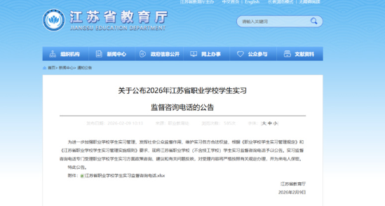 交匯點訊 日前,江蘇省教育廳公布2026年江蘇省職業(yè)學(xué)校學(xué)生實習(xí)監(jiān)督咨詢電話。公告提到,為進(jìn)一步加強(qiáng)職業(yè)學(xué)校學(xué)生實習(xí)管理,發(fā)揮社會公眾監(jiān)督作用,維護(hù)實習(xí)各方合法權(quán)益,根據(jù)《職業(yè)學(xué)校學(xué)生實習(xí)管理規(guī)定》和...