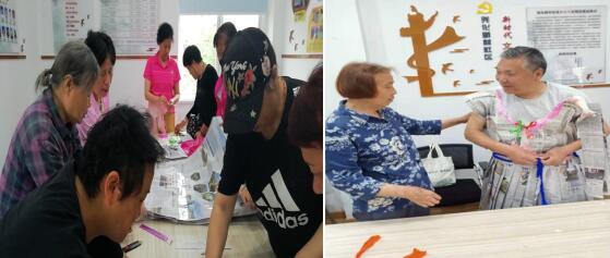 活動開始,居民們就紛紛自己動手,大家集思廣益、發(fā)揮想象力,對日常生活中的常見廢舊報紙、垃圾袋、包裝繩等垃圾進行創(chuàng)新再利用,不一會,各式各樣的服裝就做好了,乳腺癌康復期的蔣阿姨穿著用舊報紙做的連衣裙第一個亮相,踩著自信的步伐走上舞臺,還有王叔叔穿著愛人親自做的斗篷帽子也亮相舞臺中間,張阿姨穿著廢棄塑料布做成的圍裙很隨意的走上臺,雙手叉腰擺起了造型,