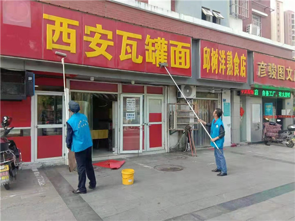 通過提前的安排部署,力爭做到不漏一戶商戶不差一塊招牌。清洗現(xiàn)場,志愿者們拿著水槍和長桿拖把,仔仔細細地清洗著所有的門頭招牌,經過水槍的沖洗,所有的招牌都煥然一新。在對商戶門頭進行大清洗時,志愿者也積極動員沿街商戶對各自“門前三包”區(qū)域進行清掃、除塵,整理堆放雜物,讓臨街道路更加干凈整潔。