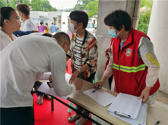 “大家不要著急,請(qǐng)有序排好隊(duì)。”“請(qǐng)接種疫苗的人,在這里領(lǐng)取健康填寫申報(bào)表,寫好后交給我們的工作人員。”6月3日下午,南京市棲霞區(qū)棲霞街道攝山村兩委班子成員在棲霞社區(qū)衛(wèi)生服務(wù)中心新冠疫苗接種點(diǎn)現(xiàn)場(chǎng),靠前做好服務(wù)保障,引導(dǎo)群眾有序進(jìn)行疫苗接種。
