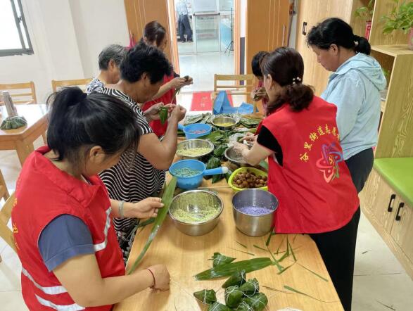 既然是端午節(jié),那粽子自然是必不可少!隨后便進(jìn)入到包粽子環(huán)節(jié)。今年的粽子可不是那么簡單的,社工為大家準(zhǔn)備了提前用紫甘藍(lán)、菠菜、莧菜等多種蔬菜汁浸泡好的彩色糯米,制成獨(dú)具特色的彩色粽子?;顒?dòng)現(xiàn)場,大家有說有笑地圍在一起,拿粽葉、舀糯米、放蜜棗、包裹、捆扎,其樂融融。參加活動(dòng)的的戴阿姨說:“端午節(jié)的時(shí)候包粽子、吃粽子,一直是我們中國的傳統(tǒng)習(xí)俗,今天的活動(dòng)不僅讓我們感受到了濃濃的傳統(tǒng)文化氛圍,而且也使大家在互幫互助的包粽子過程中增進(jìn)了感情,拉近了彼此間的距離,這樣的活動(dòng)既有意思又有意義。”