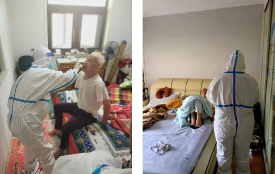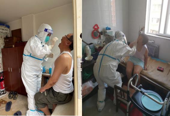 在上門檢測過程中,志愿者和醫(yī)護人員,半蹲、貓腰、曲腿,安撫并引導老人們進行核酸采樣。35度以上的高溫,即使站著不動,也是一身汗,更何況穿上厚厚的防護服,戴著密不透氣的橡膠手套,甚至是爬上六樓或更高,汗水早已將衣服浸透,留下點點鹽霜。許多同志中暑倒下,然而透透氣,通通風,歇歇腳,喝喝水,簡單自救后,繼續(xù)奮戰(zhàn)下去!這就牛首社區(qū)醫(yī)護人員,一群能吃苦、不矯情、勇?lián)數(shù)?ldquo;白衣戰(zhàn)士”。老人劉爺爺用顫抖的聲音表示感謝:“感謝政府、感謝你們白衣天使,冒著烈日來給我們查核酸,謝謝你們的辛苦付出,也請你們一定要保護好自己,向你們致敬!”