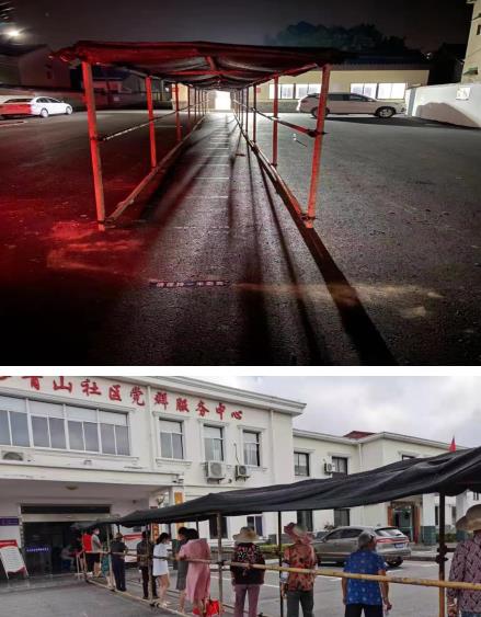青山社區(qū)的工作人員始終把居民放在第一位。社區(qū)內(nèi)沒有質(zhì)量好的合金結(jié)構(gòu)遮陽棚,工作人員就買來經(jīng)濟(jì)實惠的黑色遮陽布,雖然相對簡陋一些,但遮陽效果一點(diǎn)也不差。在核酸檢測開始的前一天晚上,社區(qū)工作人員加班加點(diǎn)搭建遮陽棚,先是將一根根竹子連結(jié),然后再把黑色遮陽布固定好,這樣青山社區(qū)的居民在排隊時就不用被烈日炙烤了。