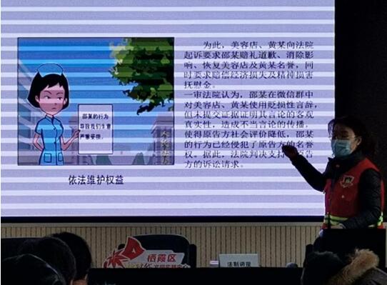 在活動現(xiàn)場,律師向黨員同志講述了網(wǎng)絡(luò)上真實發(fā)生的電信詐騙案例以及在網(wǎng)絡(luò)中散布謠言的典型案例等,用圖文并茂的方式提醒社區(qū)黨員注重生活中潛在的安全隱患,同時讓黨員同志們在開展社區(qū)工作時,從法律的角度為群眾提供幫助。