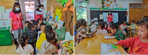 幼兒園教室里設(shè)有圖書角,志愿者精心挑選了一些精彩、經(jīng)典的繪本故事放在其中供孩子們自行挑選。簡單的文字、生動的插圖、動人的情節(jié),無一不吸引著孩子們的注意力,大家迫不及待地讀起繪本,打開一扇觀察世界的大門?,F(xiàn)場,志愿者還向孩子們介紹繪本故事,并邀請孩子講述自己喜歡的選段,分享喜歡的理由和讀后的感想,在分享互動中充分鍛煉他們的閱讀、理解、表達能力。