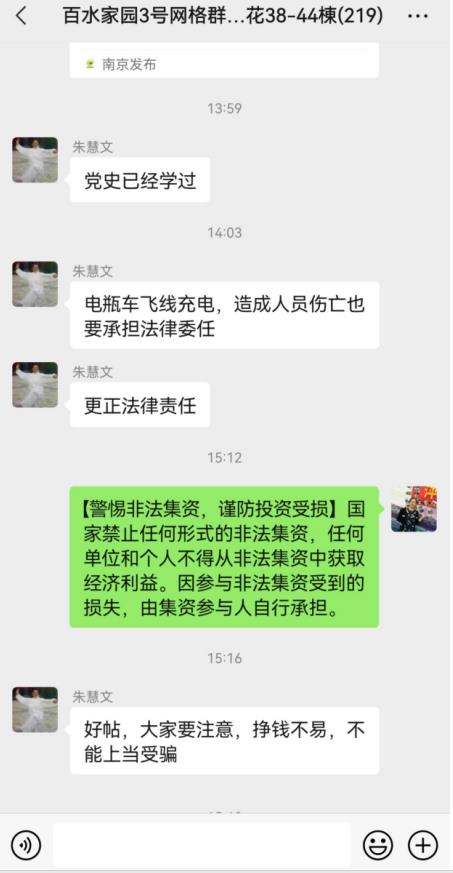同時,社區(qū)還通知電子屏播放和微信群轉(zhuǎn)發(fā)加大對防范非法集資的宣傳,提醒居民“遠離非法集資、拒絕高利誘惑”。