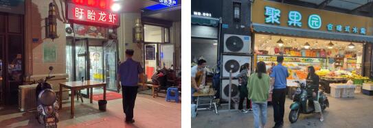與此同時,部分餐飲店門前坐吃問題、水果店門前溢攤問題也有所反彈,違規(guī)擺放的餐桌餐椅、籮筐等物品占用了公共空間,影響了居民通行。對此城管隊員與城市治理公眾委員、志愿者形成合力,加大晚間門面房巡查力度,不定時開展門店突擊檢查,督促店家整改違規(guī)問題并配合開展門前三包相關(guān)內(nèi)容的宣傳教育,提高治理成效。營造了“還路于民,還靜于民”的良好局面,贏得了周圍居民到一致的好評。