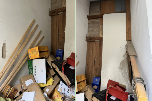 社區(qū)領(lǐng)導(dǎo)得知情況后,對此事高度重視,秉持著對違建絕不姑息的態(tài)度,迅速做出反應(yīng)。聯(lián)合小區(qū)物業(yè)管理處,安排工作人員現(xiàn)場核實(shí),發(fā)現(xiàn)通道處被木板封堵,其中堆放著各種雜物,儼然成為了“私人倉庫”。