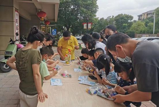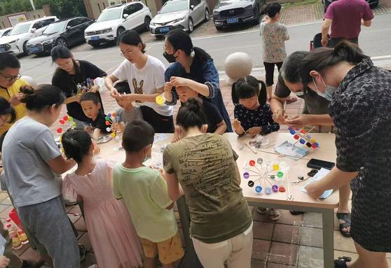 社區(qū)廣場的另一邊,志愿者通過展示拉線旋轉(zhuǎn)木馬、瓶蓋摩天輪、風(fēng)帆校車、盤子畫,讓社區(qū)居民觀察生活中產(chǎn)生的廢物如何二次利用,制作成美觀的裝飾品或者實(shí)用的科技產(chǎn)品。社區(qū)居民也積極體驗(yàn)環(huán)??萍甲髌?,使之更加深刻地體會到環(huán)保的力量。完成環(huán)保打卡的居民,參加投圈圈小游戲贏取了獎品。